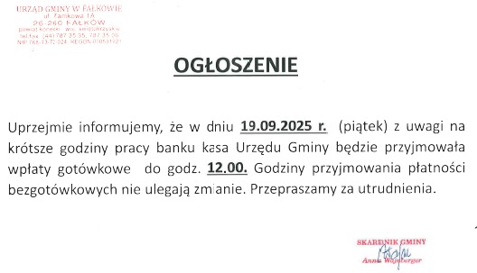 Uwagi do Programu można nadsyłać do 7 listopada 2025 r. pocztą elektroniczną: gmina@falkow.pl lub pod adres (decyduje data wpływu opinii do Urzędu Gminy w Fałkowie):